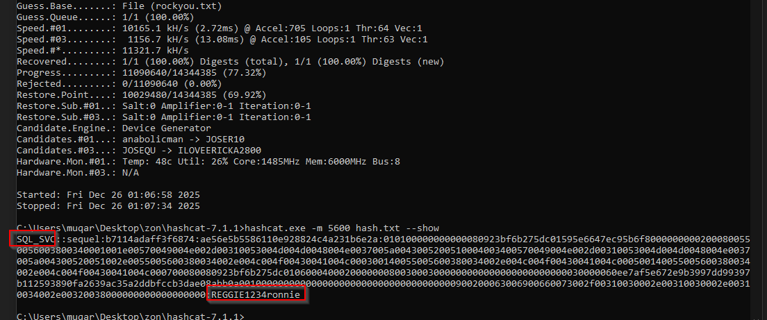 [SMB] NTLMv2-SSP Hash : sql_svc::sequel:b7114adaff3f6874:AE56E5B5586110E928824C4A231B6E2A:010100000000000080923BF6B275DC01595E6647EC95B6F80000000002000800550056003800340001001E00570049004E002D00310053004D004D0048004E0037005A0043005200510004003400570049004E002D00310053004D004D0048004E0037005A004300520051002E0055005600380034002E004C004F00430041004C000300140055005600380034002E004C004F00430041004C000500140055005600380034002E004C004F00430041004C000700080080923BF6B275DC010600040002000000080030003000000000000000000000000030000060EE7AF5E672E9B3997DD99397B112593890FA2639AC35A2DDBFCCB3DAE08ABB0A001000000000000000000000000000000000000900200063006900660073002F00310030002E00310030002E00310034002E00320038000000000000000000 on cracking with hashcat