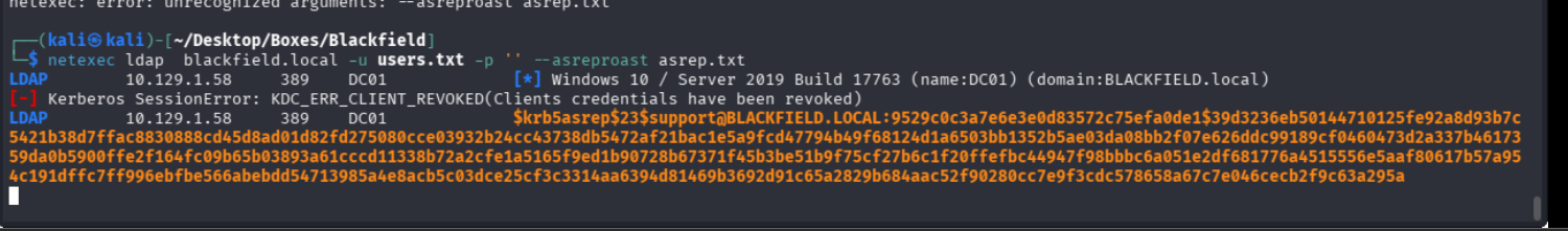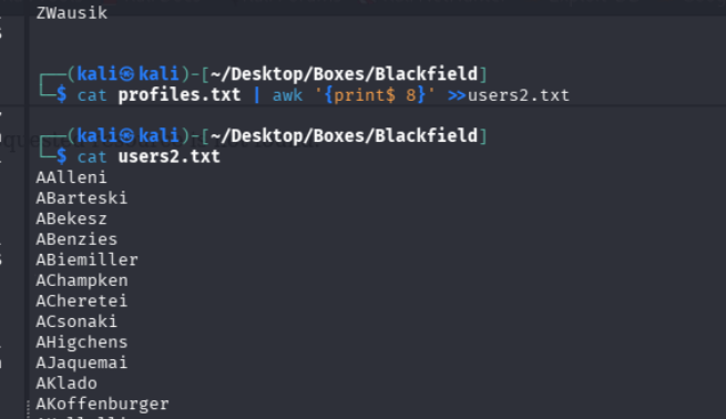 netexec smb blackfield.local -u 'guest' -p '' --rid-brute | grep "SidTypeUser" | awk -F'\\' '{print $2}' | awk '{print $1}' > users.txtAdministrator