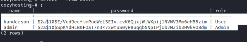 postgres:Vg&nvzAQ7XxR josh@cozyhosting.htb | | Hashes | kanderson $2a$10$E/Vcd9ecflmPudWeLSEIv.cvK6QjxjWlWXpij1NVNV3Mm6eH58zim