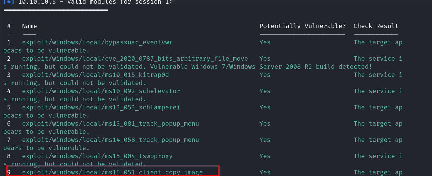 This returns us a list of exploits that we can run on the system