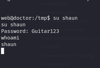 ok so we find a password from the logs that is Guitar123 and we know that a user exists with the name shaun.