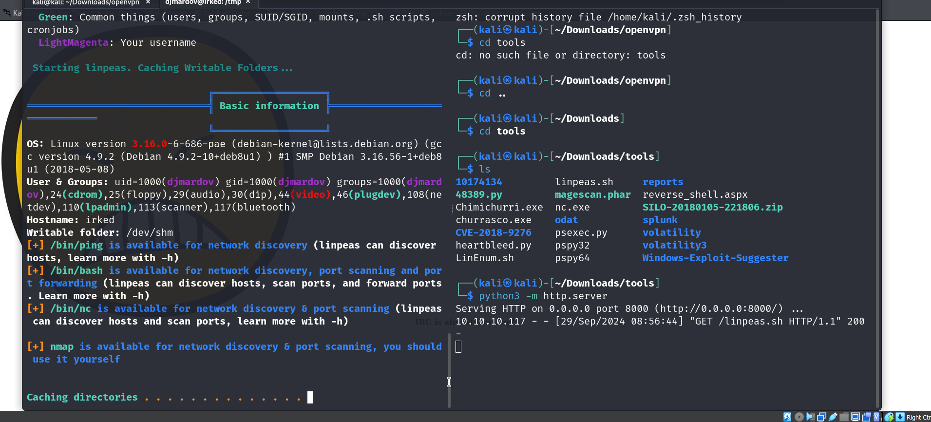 we hsot linpeas from our box using a simple python server and then use wget to grab it.