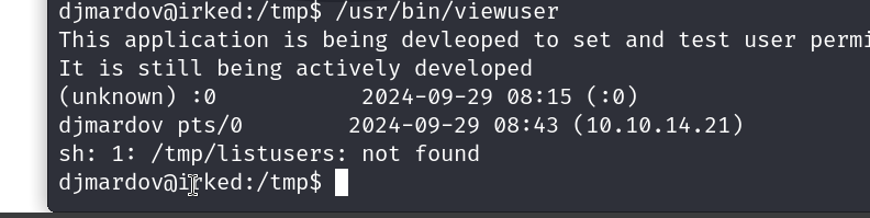 ok so it was looing for a listusers tfile to execute, we created our own listusers file with the bash shell that we need, it executes that as root and gives us a root shell.
