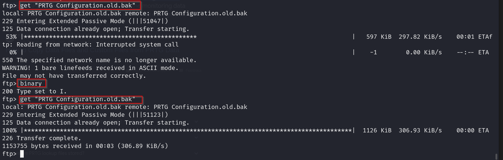 we were getting an error earlier while trying to retrieve the file with the get command but we resolve this by changing the mode to binary and then trying it out, we just have to type binary once per ftp session to change the download mode from ascii to binary apparently.