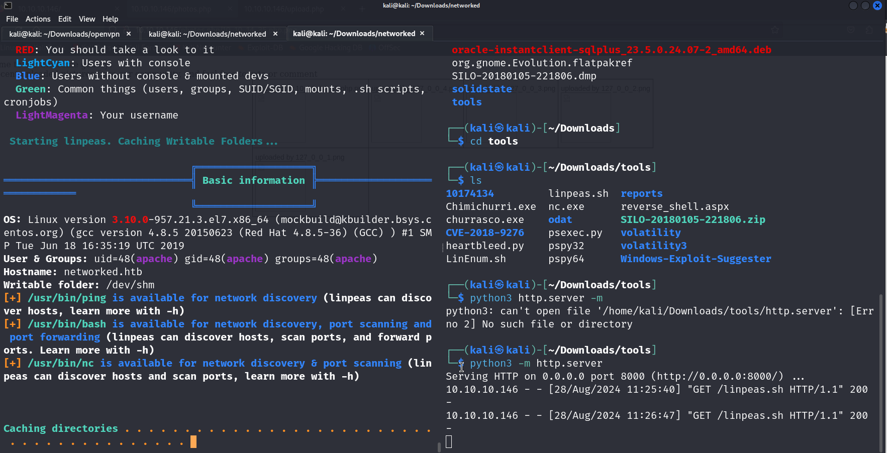 we first start a python server on our machine where linpeas is located , then from the victims machine we use a curl command to grab the file