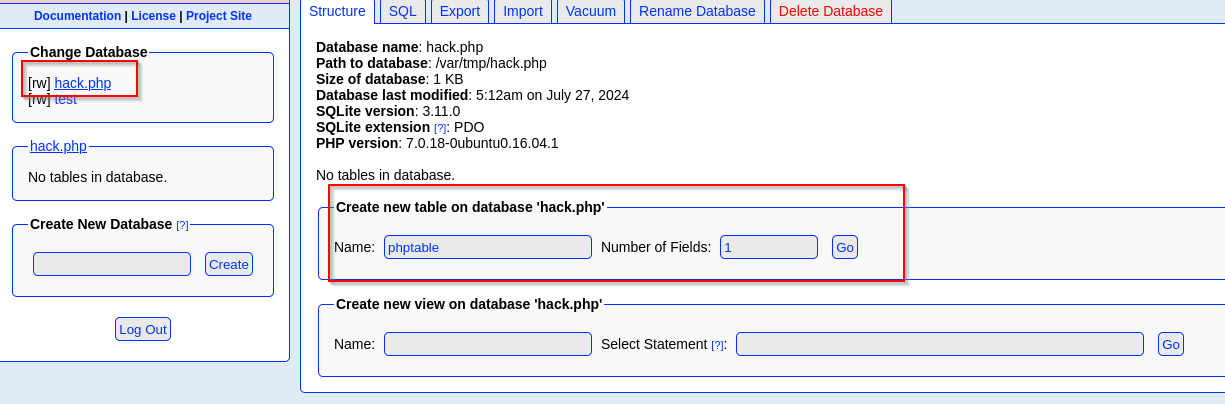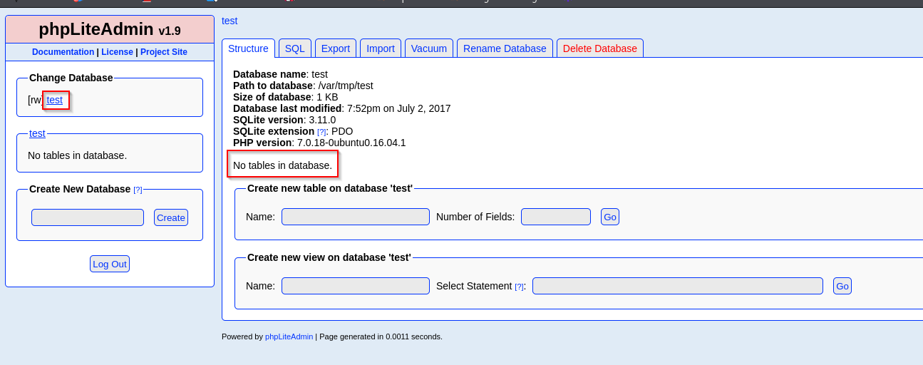 we are greeted with this page where we can infer that there is a database named test with no tables