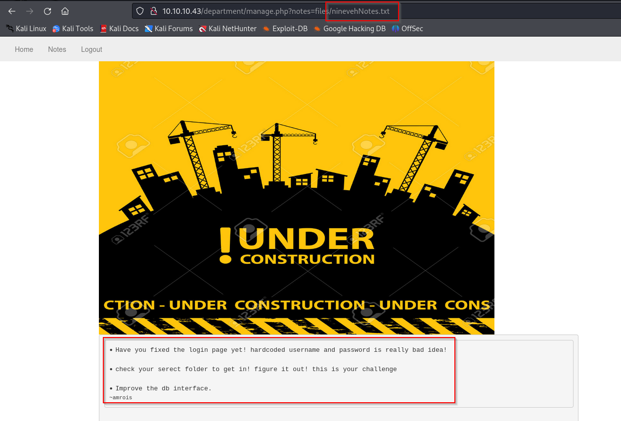 on visiting the notes page we are greeted with this , if we look carefully we can see that the file is being mentioned in the url, lets check for lfi.