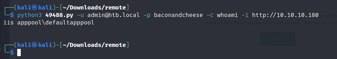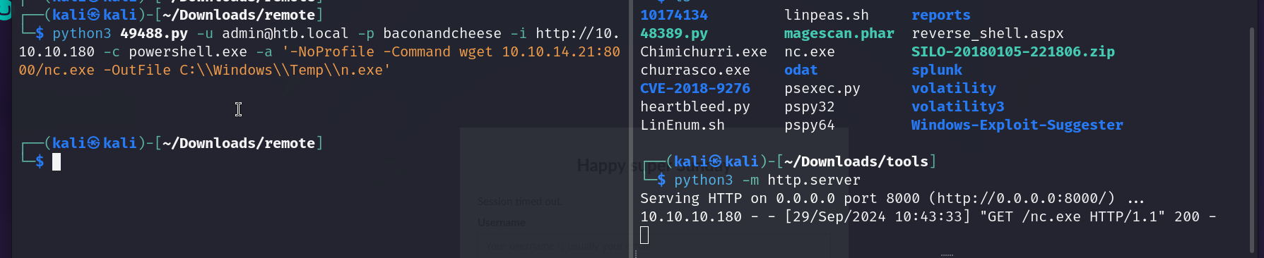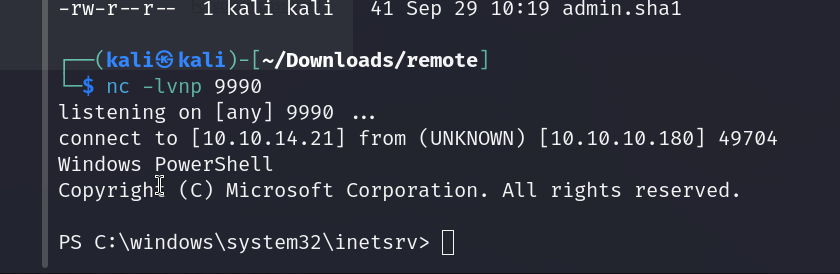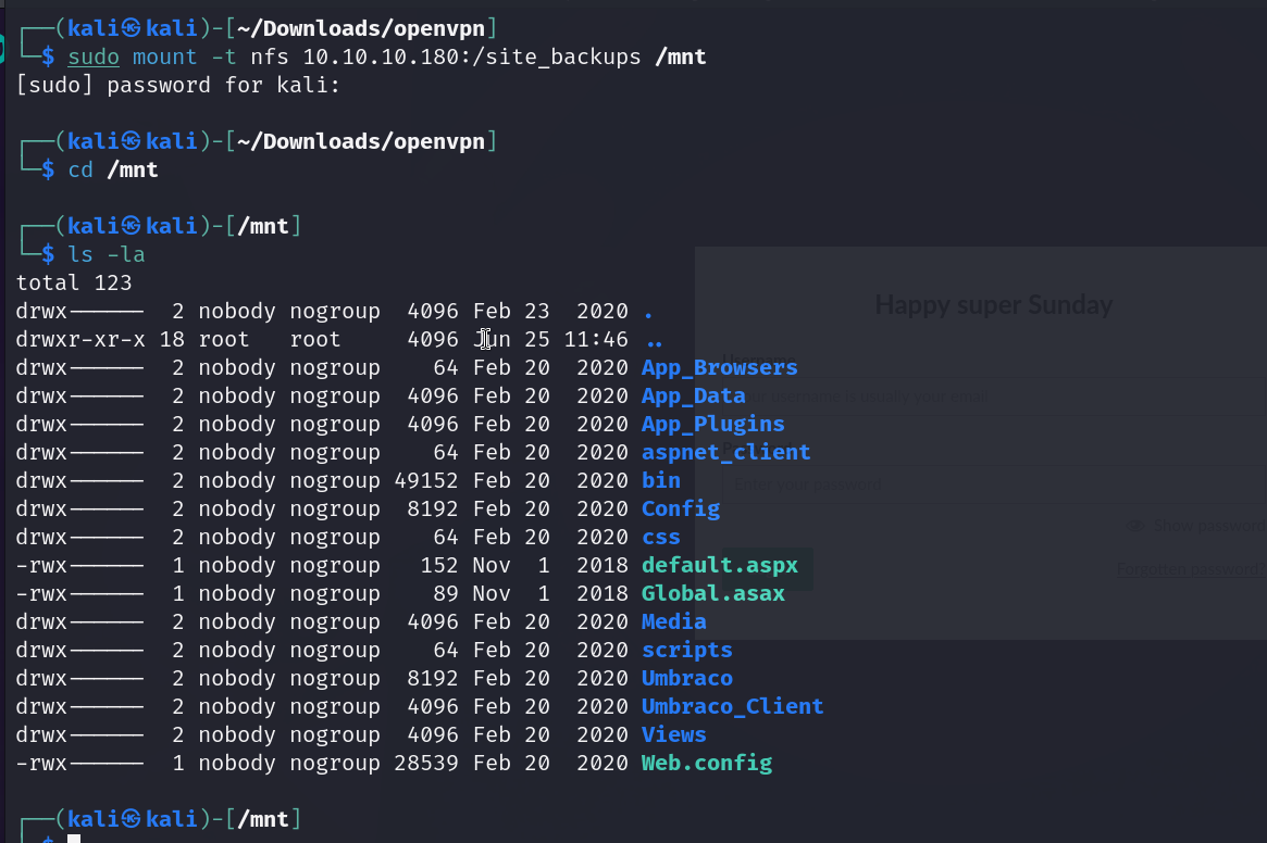 learnt how to mount something using nfs, used hashcat to crack admin creds which i found from the backup file in the mount, used an authenticated rce exploit to get nc.exe on the box with powershell and then got a basic shell, learnt to escalate privs by exploiting the self-impersonate priv using printspoofer.exe.