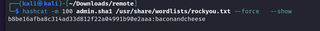 ok so when we break it with hashcat we find that the pass is baconandcheese