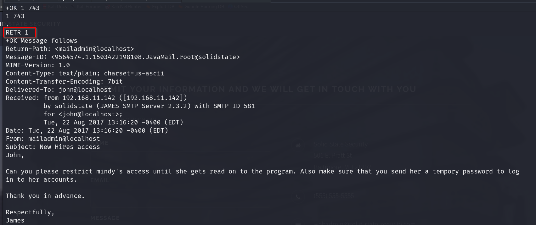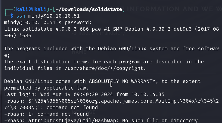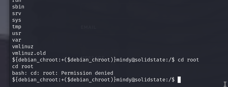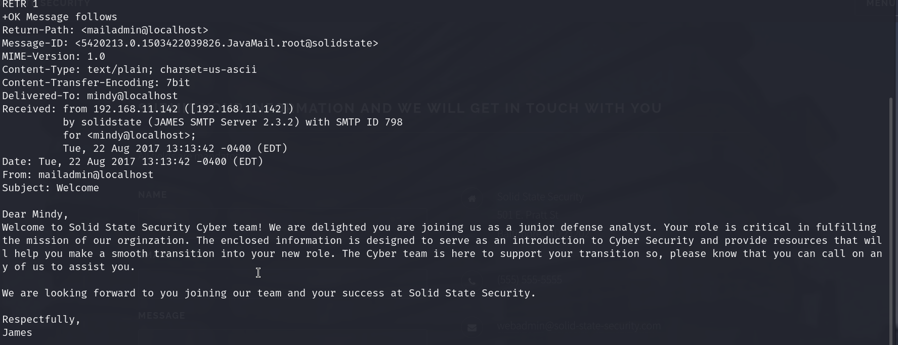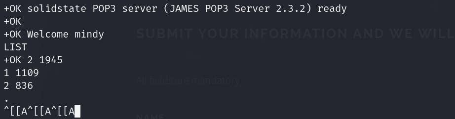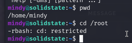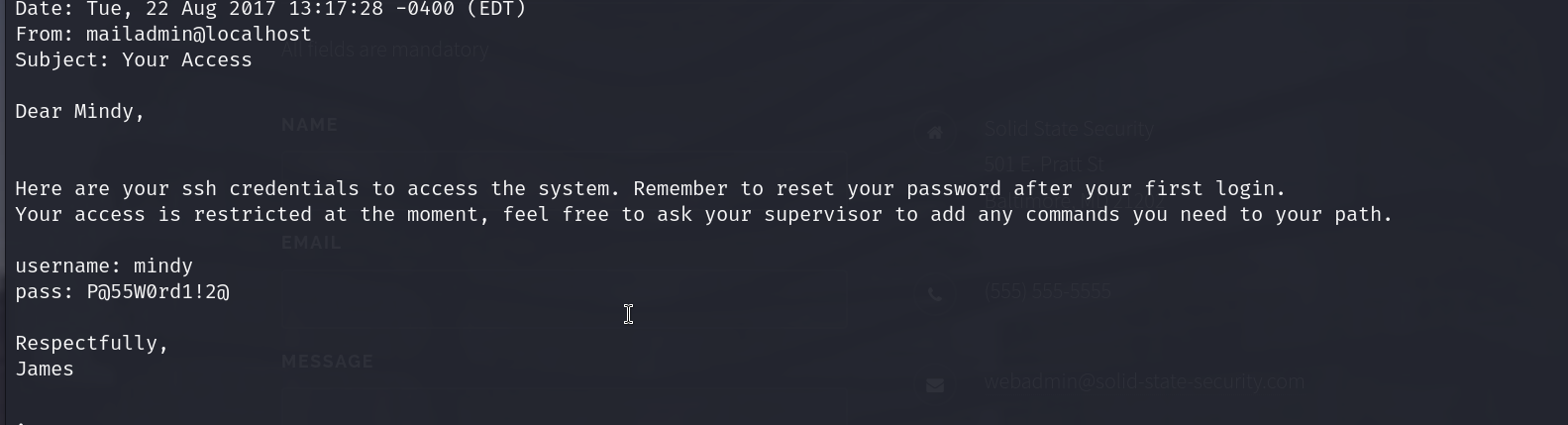 accessed james server , got ssh login details , logged in as mindy on ssh, escaped rbash shell by using a james server exploit which gave us a bash shell , enumerated using linpeas , further enumerated with linEnum , checked processes with pspy found a cron job running a root file nd used that to get a rev shell.